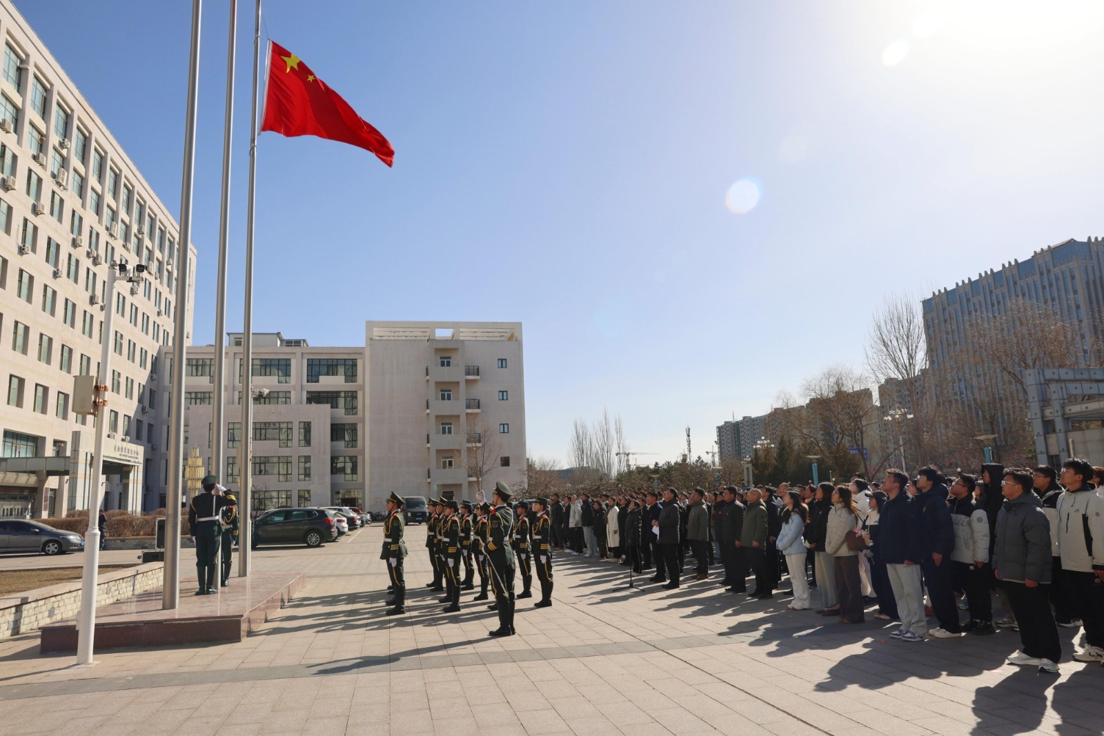 伴随着雄壮激昂的《义勇军进行曲》,鲜艳的五星红旗迎着晨光冉冉升起。全体师生肃立行注目礼,齐声高唱国歌,炽热的爱国情怀在每一位北院人心中澎湃涌动。